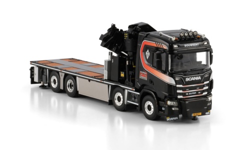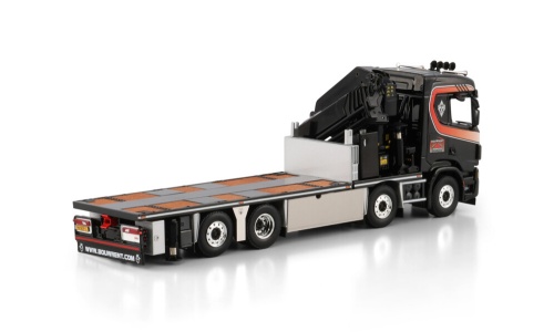 WSI 01-4669 BOUWRENT; SCANIA R NORMAL CR20N 8X2 TAG AXLE RIGED FLATBED TRUCK WITH PALFINGER PK 78002